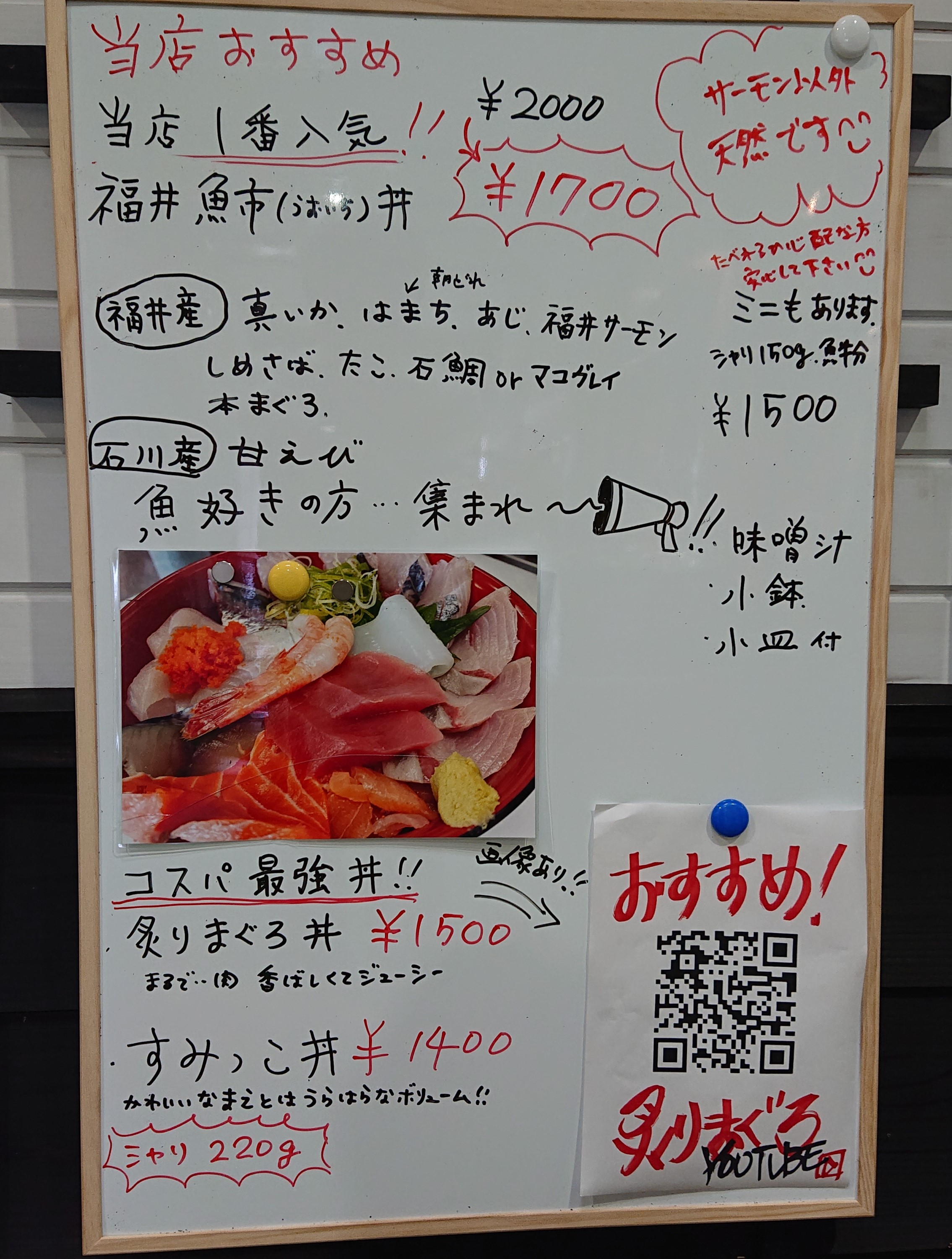 魚慶では、ふくいサーモン以外は天然モノを載せた福井魚市丼2,000円を1,700円でご提供。