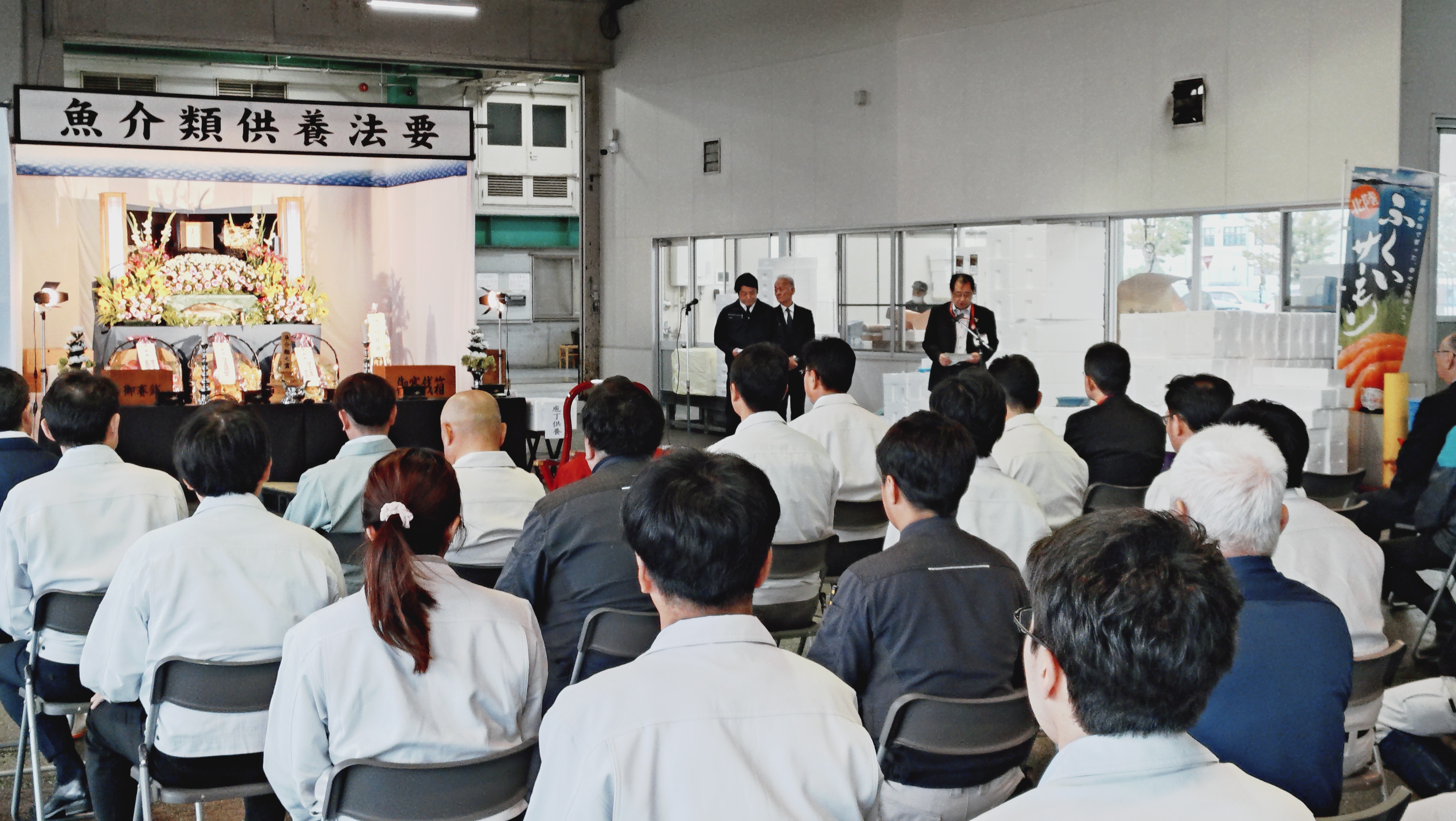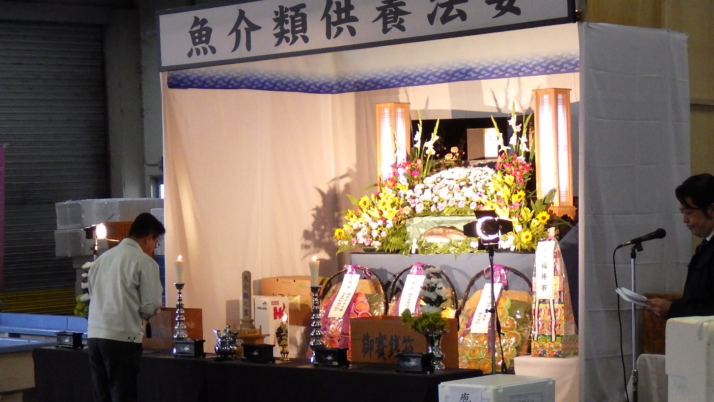 10月21日(火)7時から水産物部のせり場において、魚介類(おさかな)供養法要が営まれました。法要では、水産物部の関係者数十名が一人ずつ焼香、合掌し自然の恵みである魚介類の功徳に対し供養をされていました。