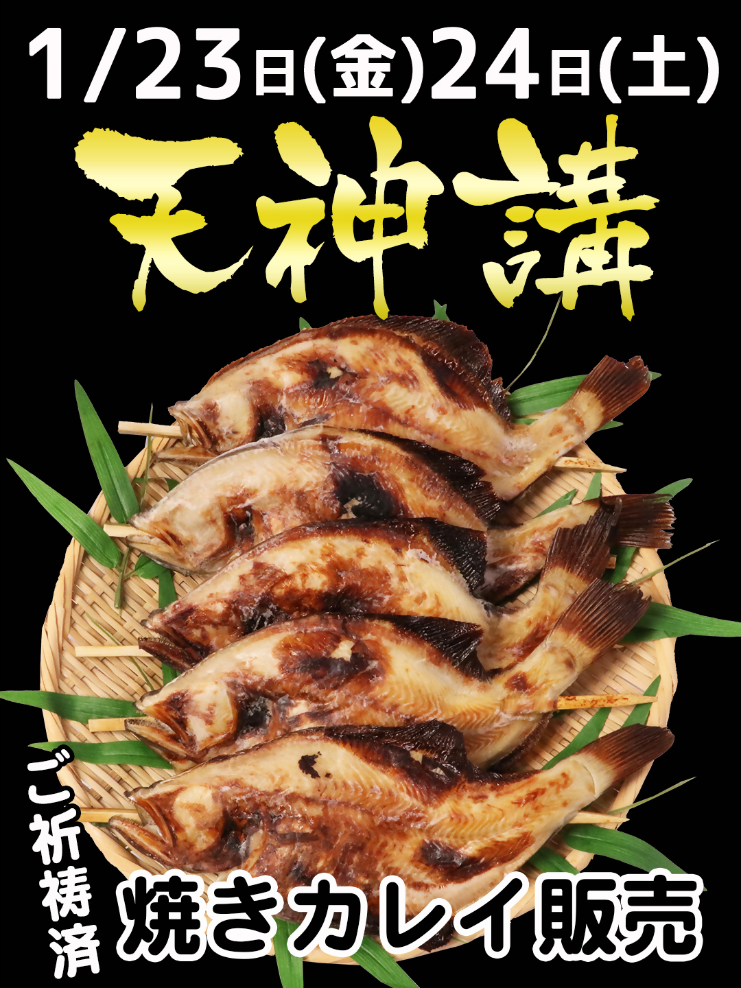 1月25日(日)の「天神講」にちなみ、ふくい鮮いちばでは、23日(金)と24日(土)に天神講イベントとして、ご祈祷済みの焼きカレイや越前がれいを販売します。