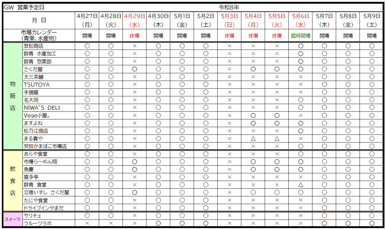 ふくい鮮いちばの2026年GW (ゴールデンウィーク)期間の営業予定日をお知らせします。店舗によって休業日が異なりますので、営業日カレンダーをご確認の上、お越しください。